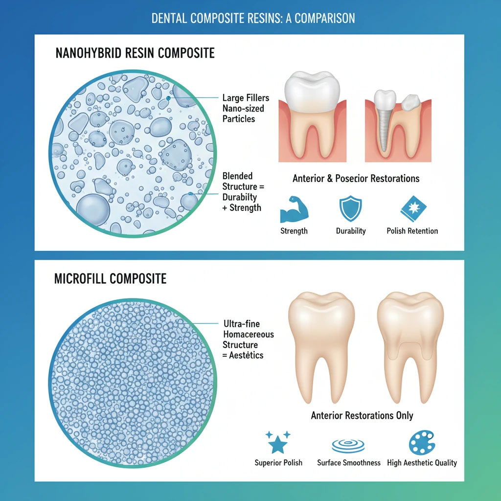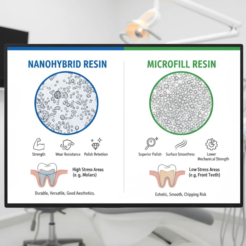 در میان انواع کامپوزیت های رزینی، رزین نانوهیبرید و کامپوزیت میکروفیل دو دسته پرکاربرد هستند. هر کدام ویژگی های شیمیایی، فیزیکی و بالینی خاصی دارند که تعیین کننده ماندگاری، ظاهر و راحتی استفاده خواهند بود. رزین های نانوهیبرید نسل جدیدی از کامپوزیت ها هستند که ذرات پرکننده (Filler) آنها ترکیبی از اندازه های نانو و میکرو است، در حالی که کامپوزیت های میکروفیل عمدتا دارای ذرات بسیار ریز (کمتر از 100 نانومتر) بوده و تمرکز آنها بر روی زیبایی و سطح بسیار صاف پس از پولیش است.