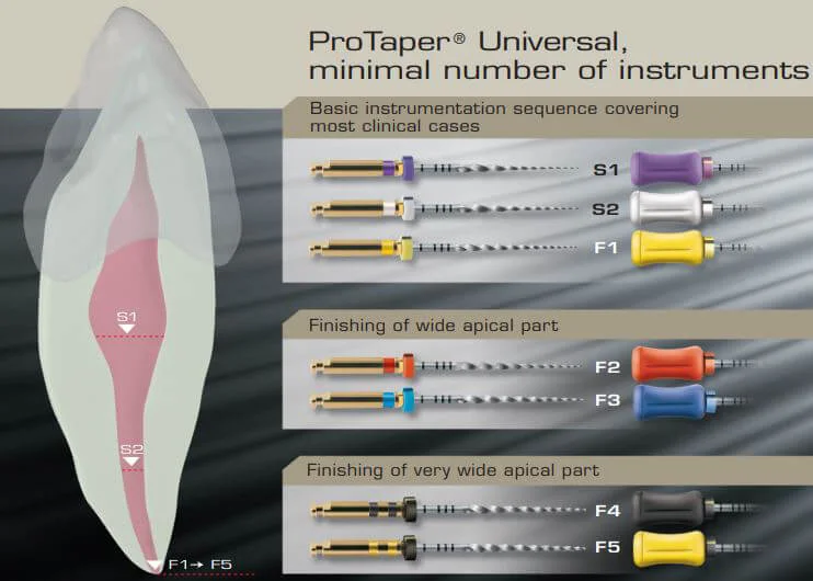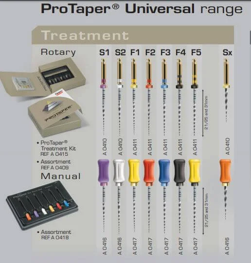 فایل های ProTaper دارای یک مقطع مثلثی به تدریج برآمدگی با راندمان برش بالا هستند. تماس دستگاه با دنتین کاهش می یابد تا از پیچ خوردن جلوگیری شود. زاویه متغیر مارپیچ ، نوک  بدون برش و طراحی منحصر به فرد چند تکه ، از بین بردن بهتر مواد باقیمانده را تسهیل می نماید. فایل روتاری Dentsply  زیر در سیستم جهانی ProTaper گنجانده شده است:
