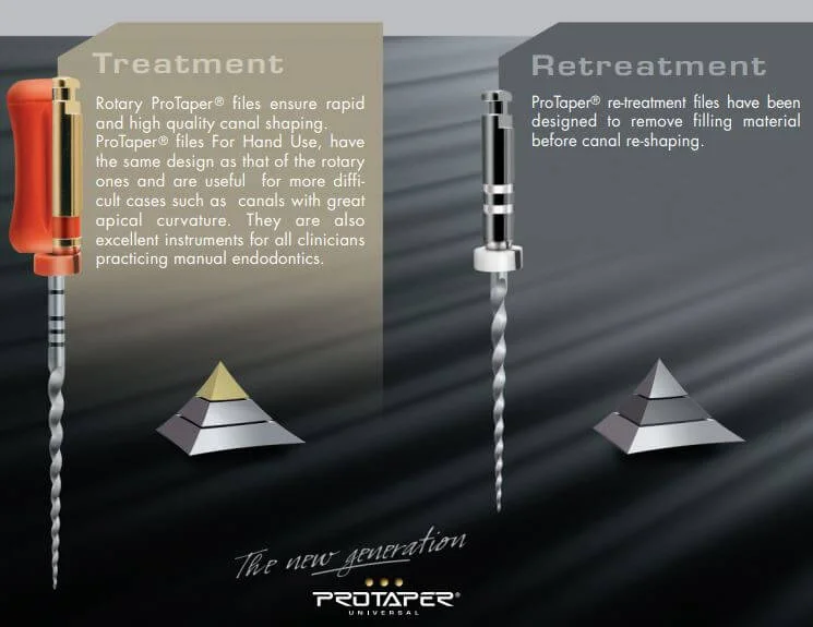 فایلهای Rotary ProTaper ensure از شکل دهی سریع و با کیفیت کانال استفاده می کنند. فایلهای ProTaper For برای استفاده در دست ، از طراحی مشابه آن با روتاری استفاده کرده و برای موارد دشوارتر مانند کانال هایی که دارای انحنای بزرگ آپیکال هستند مفید هستند. آنها همچنین ابزارهای عالی برای کلیه پزشکان متخصص آندودنتیکس  هستند.