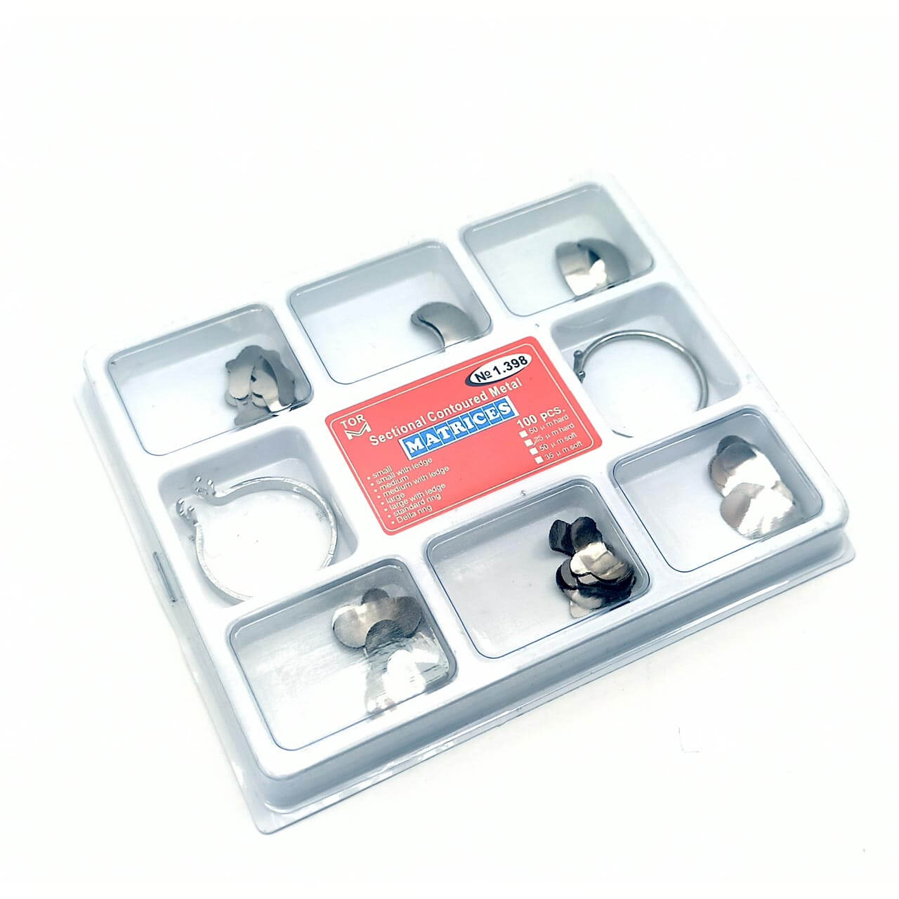 این نوع از تجهیزات دندان پزشکی در بخش ترمیم دندانپزشکی کاربردی است . کیت نوار ماتریس سکشنال 100 عددی Tor VM از مواد اولیه بسیار با کیفیتی تولید می گردند که مورد تائید اداره تجهیزات دندانپزشکی می باشد . کیت نوار ماتریس سکشنال 100 عددی Tor VM دارای انواعی از نوارهای ماتریس در اندازه های متفاوتی می باشند که هر یک کاربردی متفاوت دارند و درجایگاه های مناسب از این نوار ماتریکس بند استفاده می گردد .